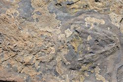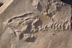 Соляной купол Ходжамумин. Таджикистан. В пермском периоде происходило самое значительное в истории Земли соленакопление в водоемах | Участок раннепермского водоема с амфибиями Utegenia Shpinari (около 290 млн лет), ~20см с прорисовкой их залегания. Юго-восточный Казахстан. Палеонтологический музей. Москва |