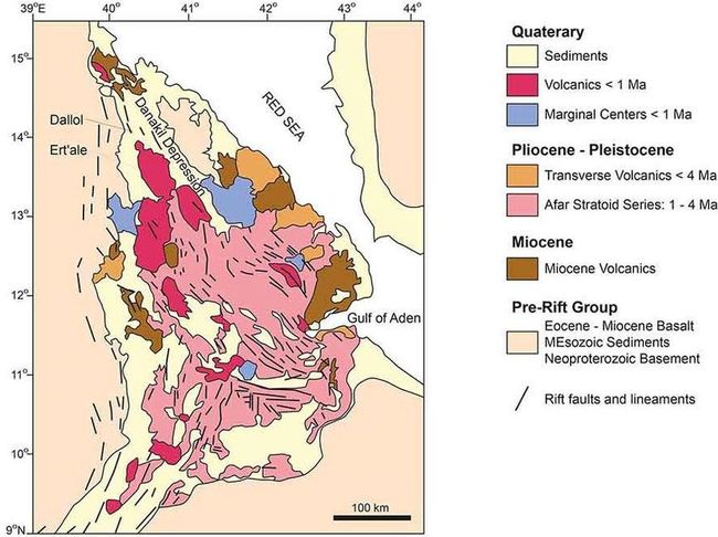 Две трети Данакильской депрессии покрывают плиоценовые базальты и андезиты возрастом 4 - 1 млн лет, излившиеся из трещин при лавовом вулканизме, которые перекрываются осадочными породами плиоценового возраста – гипсоносными обломочными и карбонатными породам и мощными соляными отложениями (эвапоритовые и морские с коралловыми и устричными прослоями) четвертичного возраста. К вулканическим щитам относятся вулканический щитовой комплекс Эрта-Але, Тат-Але и Алайта, хребет Алайта- и Манда-Хараро и геотермальная зона Даллол.