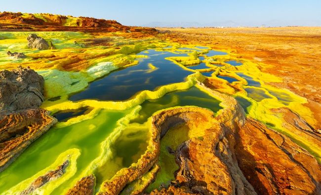 Кислотные бассейны вулкана Даллол в депрессии Данакил. Вулкан расположен ниже уровня океана. Фото Chalanrat Rerkrat and Carmen J. Fuentes Sanchez |