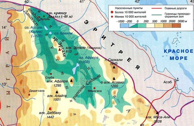 Данакильская депрессия длиной около 200км находится на севере Эфиопии и представляет собой молодой рифт, поверхность которого находится на глубине 120 м ниже уровня моря. На дне впадины распространены фумаролы, горячие источники, гейзеры, действующие щитовые вулканы, в том числе постоянное лавовое озеро – Эрта Але.