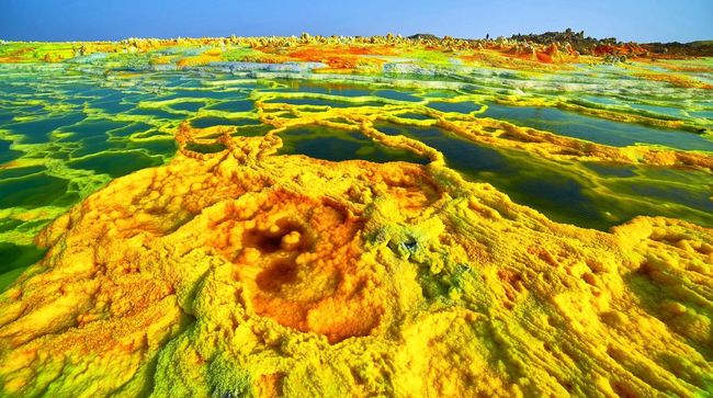 Кислотные бассейны вулкана Даллол в депрессии Данакил. Вулкан расположен ниже уровня океана. Фото Chalanrat Rerkrat and Carmen J. Fuentes Sanchez |