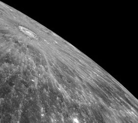 Если бы на орбите Меркурия находились люди, они увидели бы его поверхность однообразно-бурой."Камера "Мессенджера" работает в диапазоне от ультрафиолетового до инфракрасного излучения. Кроме того, использована компьютерная обработка для усиления цветовых оттенков поверхности, отражающих состав меркурианских скал.