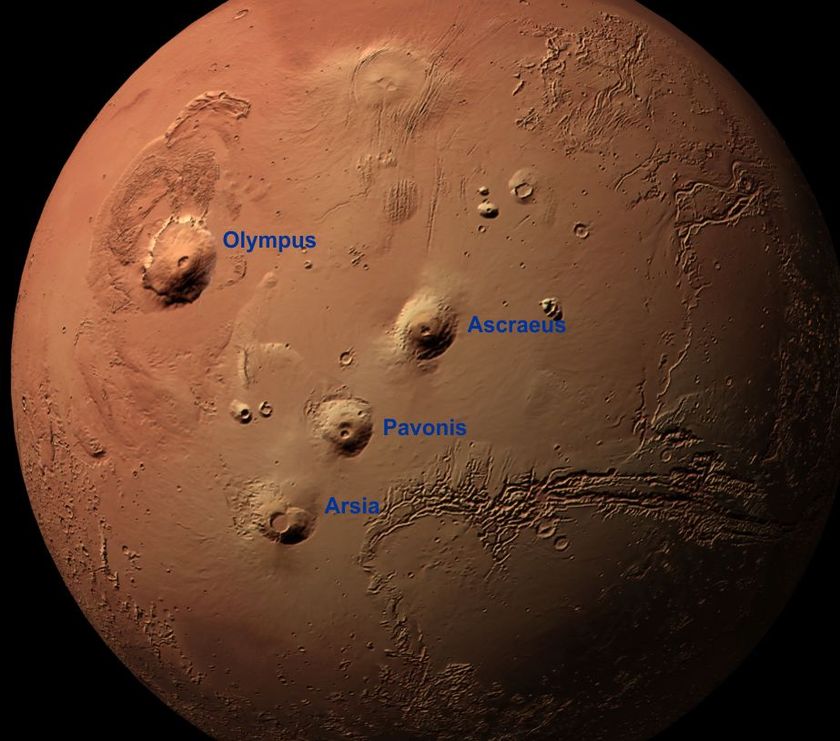 Диаметр вулканической кальдеры Олимпа состоящей из шести перекрывающихся вулканических кратеров достигает 85км. Глубина кальдеры 3 км.