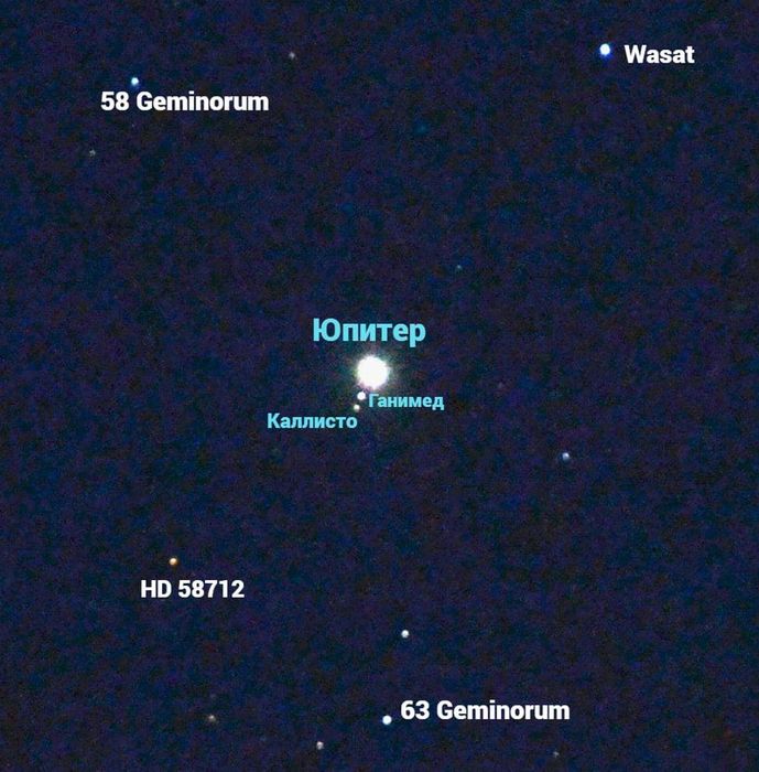Nikon D7000, объектив AF-S Nikkor 18-135, ISO 3200, zoom 135, d5.6, выдержка 1сек; увеличение эффекта света и контрастности; Ио и Европа засвечены Юпитером